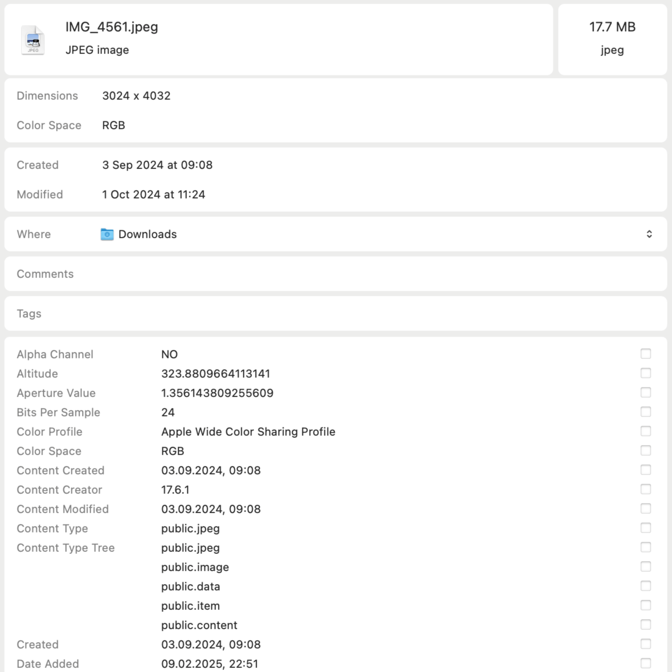 The top of the Info pane shows a summary: name, dates, size, keywords, comments, and more.